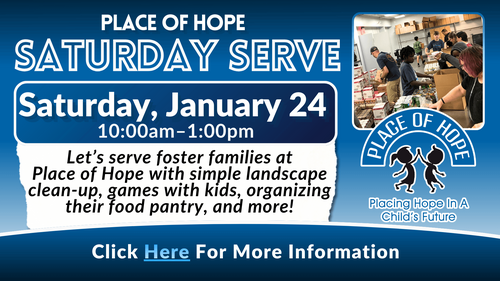 Join us on January 24 from 10:00am–1:00pm for a Saturday Serve at Place of Hope, serving foster children and families through hands-on projects and encouragement.