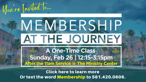 This Membership Class will be offered In-Person @ The Journey's Ministry & Worship Center right after the 11am In Person Worship Service on Feb 26 (Free lunch and Childcare will be provided)